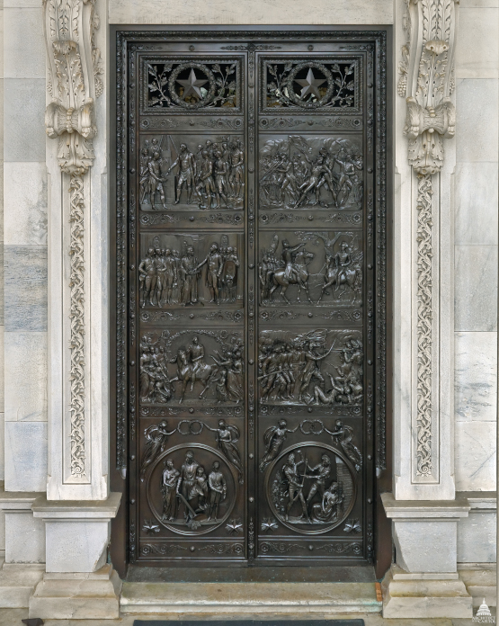 At the founding of the Capitol building on Sept. 18, 1793, the Sun and Mercury were in the constellation of Virgo. This is memorized on the Senate building's bronze doors. The top-left plate shows George Washington, wearing a white satin Masonic apron, using a trowel to lay the cornerstone. The apron shows American and French flags, a gavel and a triangle symbolizing a universal deity surrounded by stars.